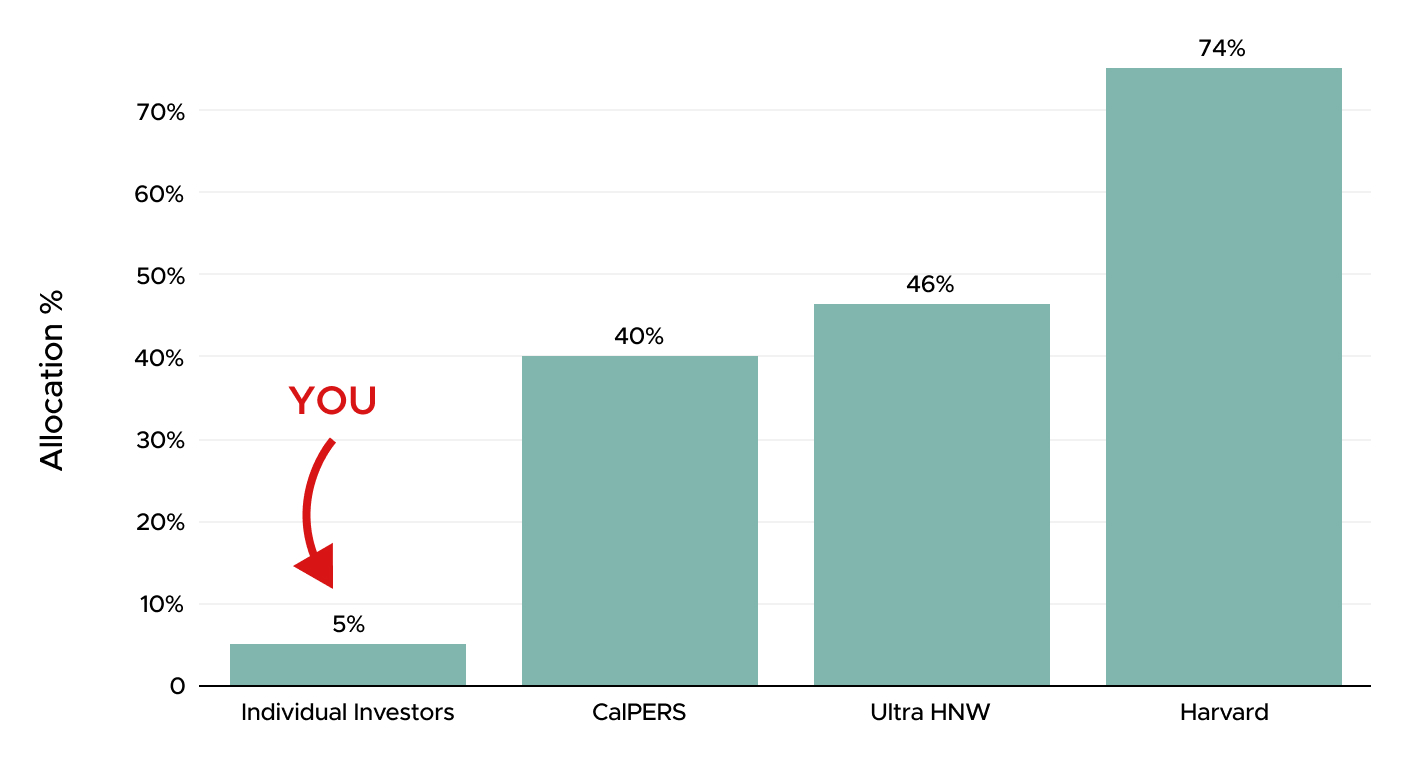 While institutions and ultra high net worth moved billions into alternatives - CalPERS $200B, Harvard $39B - individual investors remain left behind with less than 5% allocation to alts.