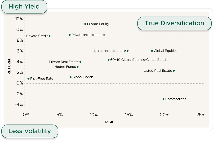Past performance does not guarantee future results. For illustrative purposes only. Information does not represent returns of a fund. An investor cannot invest in an index. Global Equities represented by the MSCI World Index, Global Bonds by the Bloomberg Global Aggregate Bond Index, Private Equity by the Preqin Private Equity Index, Private Credit by the Cliffwater Direct Lending Index, Private Infrastructure by the Preqin Private Infrastructure Index, Private Real Estate by the Preqin Private Real Estate Index, Commodities by the Bloomberg Commodity Index, Hedge Funds by the HFRI Weighted Composite Index, Risk Free Rate by the ICE BofA US 3-Month Treasury Bill, Listed Real Estate by the FTSE EPRA Nareit Developed Index, and Listed Infrastructure by the FTSE Global Core Infrastructure 50/50 Index after December 31, 2014; data from July 30, 2008 through December 31, 2014 represented by the Dow Jones Global Infrastructure Index. Source: Bloomberg, Preqin, HFRI, Morningstar. For the period January 1, 2008 through September 30, 2023.