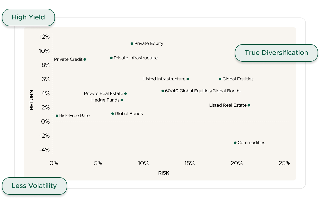 Past performance does not guarantee future results. For illustrative purposes only. Information does not represent returns of a fund. An investor cannot invest in an index. Global Equities represented by the MSCI World Index, Global Bonds by the Bloomberg Global Aggregate Bond Index, Private Equity by the Preqin Private Equity Index, Private Credit by the Cliffwater Direct Lending Index, Private Infrastructure by the Preqin Private Infrastructure Index, Private Real Estate by the Preqin Private Real Estate Index, Commodities by the Bloomberg Commodity Index, Hedge Funds by the HFRI Weighted Composite Index, Risk Free Rate by the ICE BofA US 3-Month Treasury Bill, Listed Real Estate by the FTSE EPRA Nareit Developed Index, and Listed Infrastructure by the FTSE Global Core Infrastructure 50/50 Index after December 31, 2014; data from July 30, 2008 through December 31, 2014 represented by the Dow Jones Global Infrastructure Index. Source: Bloomberg, Preqin, HFRI, Morningstar. For the period January 1, 2008 through September 30, 2023.